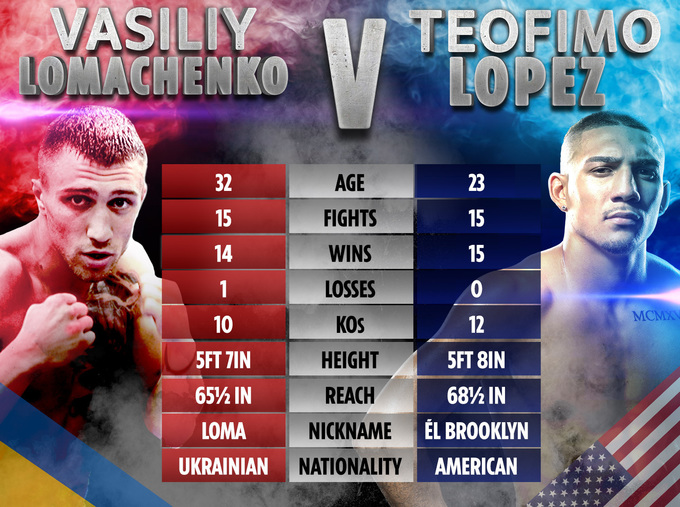 В поединке за титул абсолютного чемпиона мира в легком весе сошлись чемпион мира WBC (франчайзинговый), WBA Super, WBO Василий Ломаченко (14–1, 10 КО) и обладатель пояса IBF Теофимо Лопес из США (15–0, 13 КО).
