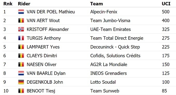 Голландский гонщик команды «Alpecin-Fenix» Матье Ван дер Пул стал победителем Тура Фландрии-2020. В финишном спринте он опередил бельгийца Воута Ван Арта из «Jumbo Visma».