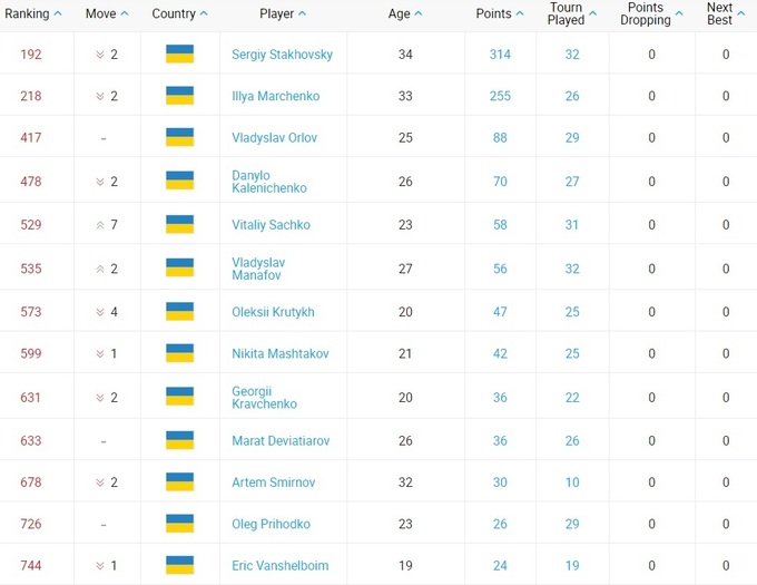 Что касается украинцев, то кардинальных изменений нет. Наши первый ракетки не играли и улучшить свое положение не могли.