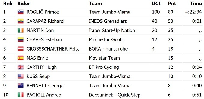 Словенский гонщик Примож Роглич выиграл стартовый этап Вуэльты-2020. Действующий чемпион гонки опередил Ричарда Карапаса и Дэна Мартина.