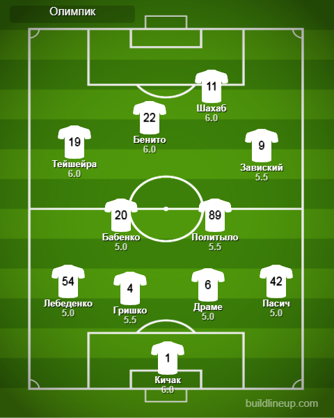 «Олимпик»: Кичак, Лебеденко, Пасич (Ксенз, 62), Гришко, Драме, Бабенко, Завийский (Романовский, 62), Тейшейра (Чогадзе, 78), Политіло (Каргбо, 78), Бенито (Альваренга, 89) , Шахаб