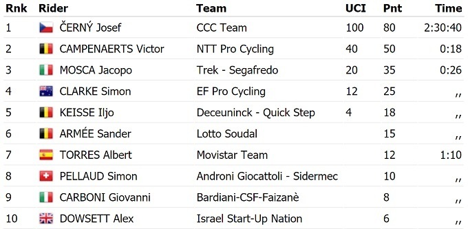 Чешский гонщик команды ССС Йозеф Черны выиграл 19-й этап Джиро д’Италия. Розовая майка осталась на плечах голландца Вилко Келдермана из команды «Sunweb», который перехватил лидерство вчера после 18-го этапа.