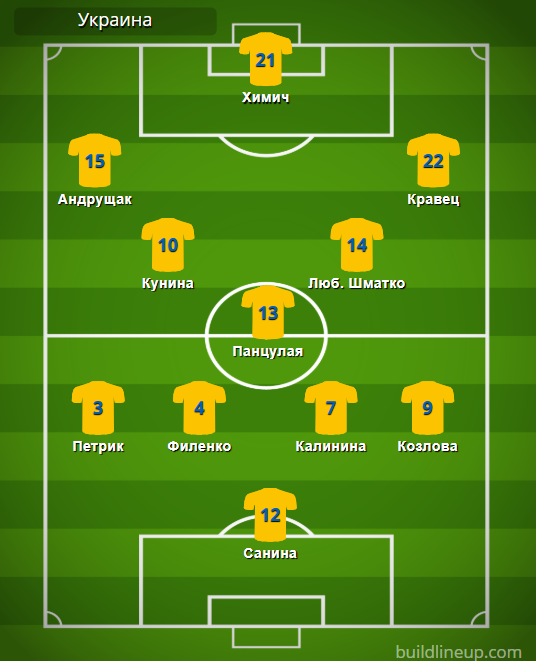 Украина: Санина – Петрик (Подольская, 74), Филенко (Анастасия Воронина, 80), Калинина (Малахова, 46), Козлова (Христюк, 80) – Кунина, Панцулая, Люб. Шматко – Андрущак (Анна Воронина, 62), Химич, Кравец.
