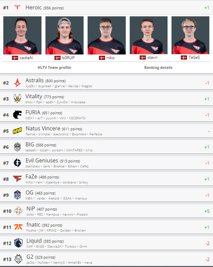 Astralis опустилась на вторую позицию, а Team Vitality поднялась на третье место, опередив FURIA Esports. Natus Vincere сохранили пятую строчку.