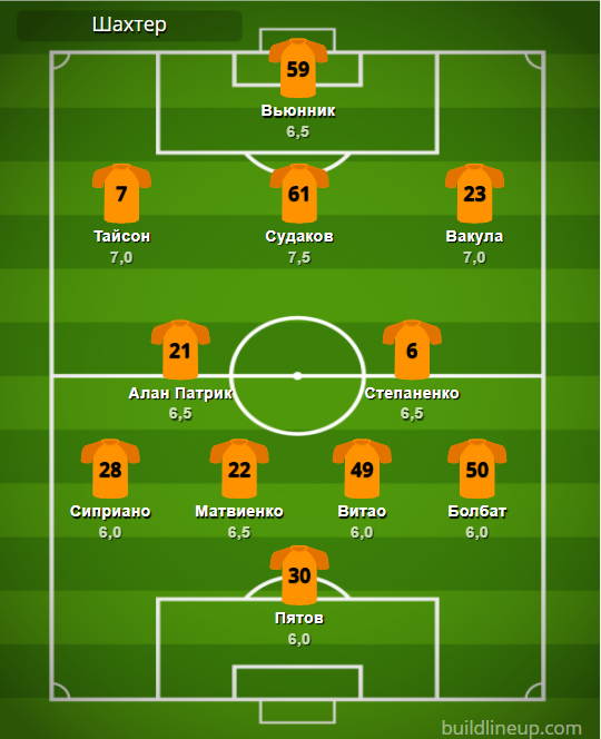«Шахтер»: Пятов – Сиприано, Матвиенко, Витао, Болбат – Алан Патрик, Степаненко – Тайсон, Судаков, Вакула (Мораес, 69) – Вьюнник (Тете, 59).