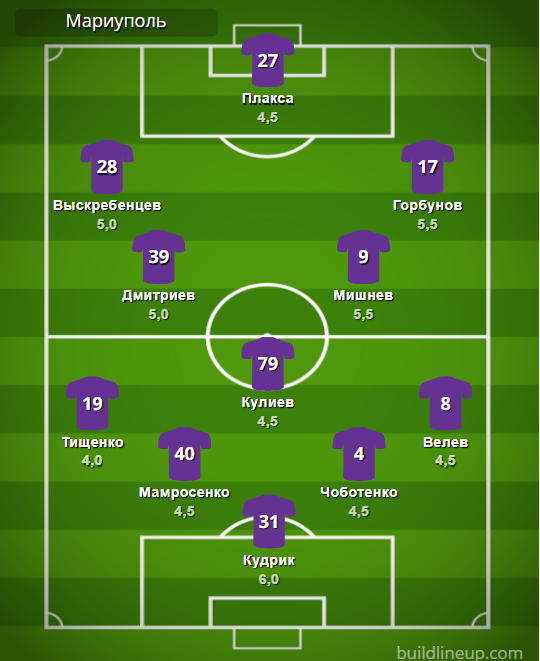 «Мариуполь»: Кудрик – Велев, Чоботенко, Мамросенко, Тищенко – Горбунов, Дмитриев, Выскребенцев, Мишнев, Кулиев – Плакса (Фурсенко, 74).