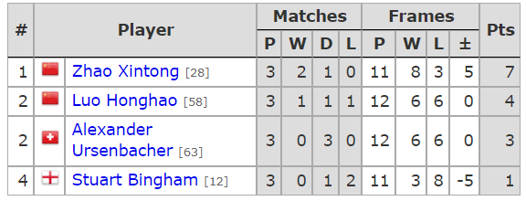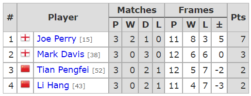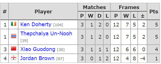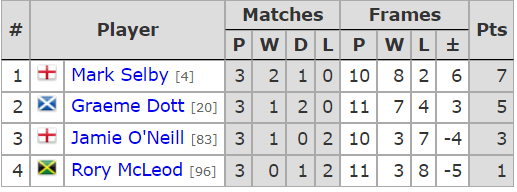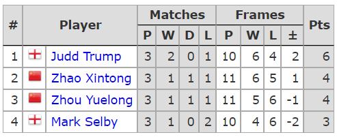 В группе 1 первым стал Джадд Трамп. Он выиграл свои матчи у Чжоу Юэлуна и Чжао Синьтуна, так что поединок с Марком Селби оставался формальностью. Селби победил и набрал первые очки в группе, но все равно остался на последнем месте.