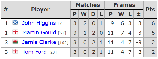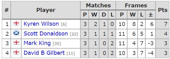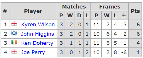 В группе 2 победителем стал Кайрен Уилсон. А в матче с ним Джон Хиггинс оформил максимум! 159-й в истории профессионального снукера и 11-й в карьере Хиггинса. По этому показателю он догнал Стивена Хендри, больше на счету только Ронни О’Салливана – 15. К слову, на турнире это вторая серия в 147 очков: на первом этапе максимум удалось сделать Райану Дэю.