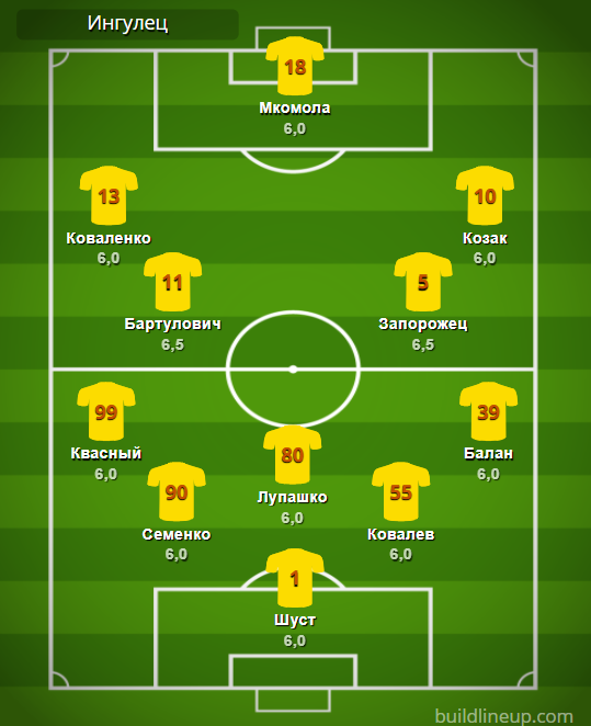 «Ингулец»: Шуст – Квасный, Семенко, Лупашко (Кучеренко, 24), Ковалев, Балан – Коваленко (Янаков, 46), Бартулович, Запорожец, Козак – Мкомола (Ситчинава, 65).