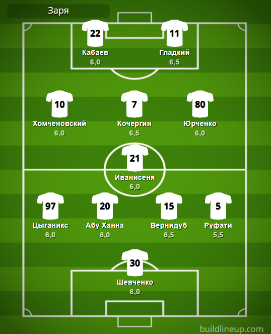 «Заря»: Шевченко – Цыганикс, Абу Ханна, Вернидуб, Руфати (Назарина, 66) – Иванисеня – Хомченовский, Кочергин, Юрченко – Гладкий, Кабаев (Сайядманеш, 81).