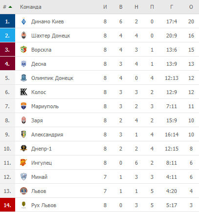 Единоличным лидером остается киевское «Динамо» – 20 очков, на втором месте идет донецкий «Шахтер» – 16 пунктов. «Ворскла» оступилась во Львове и замыкает топ-3 (15 баллов).