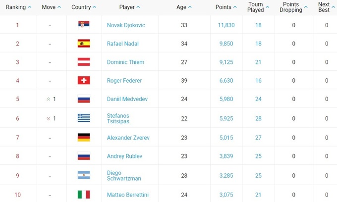 В первой десятке лишь одно изменение: Даниил Медведев немного опередил Стефаноса Циципаса.