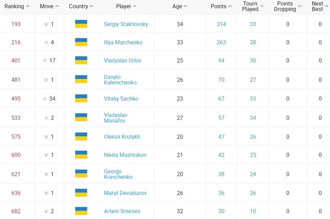 Что касается украинцев, то наиболее заметного прогресса добился Виталий Сачко, который невероятным образом попал в список участников квалификации в Вене, после чего еще и в статусе лаки-лузера сыграл в первом круге основы. Виталий дебютирует в топ-500. Также стоит отметить Владислава Орлова, который подбирается к четвертой сотне. У остальных изменения незначительные.