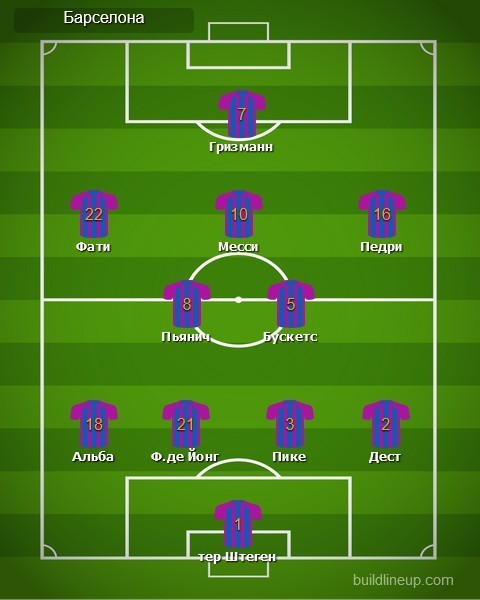 «Барселона»: Марк-Андре тер Штеген, Жорди Альба, Жерар Пике, Серджино Дест, Френки де Йонг, Миралем Пьянич (Серхи Роберто, 60), Серхио Бускетс (Клеман Лангле, 74), Педри (Карлес Аленья, 83), Ансу Фати (Франсиску Тринкан, 74), Лионель Месси, Антуан Гризманн (Усман Дембеле, 60)