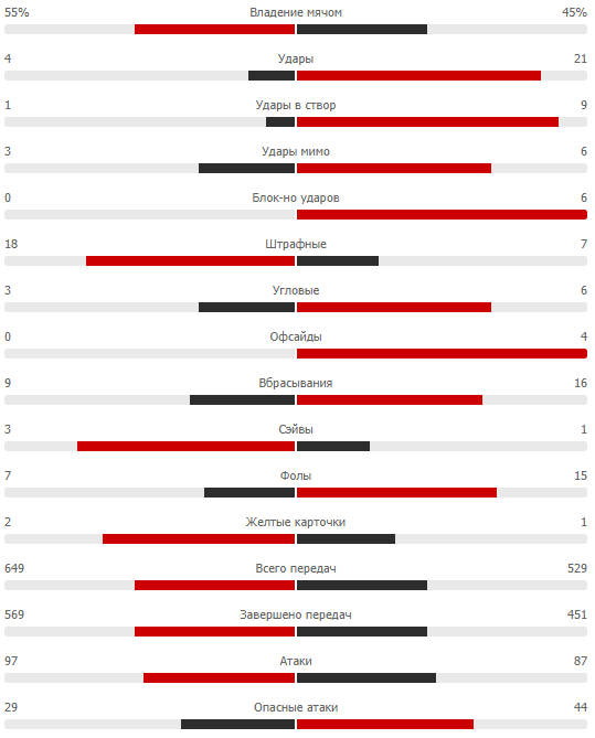По количеству ударов хозяева безнадежно уступили сопернику: 4–21 (в створ: 1–9). Зато у команды Луиша Каштру аж 55% владения мячом (перевес получился за счет второго тайма, когда гостей ситуация на табло полностью устраивала).