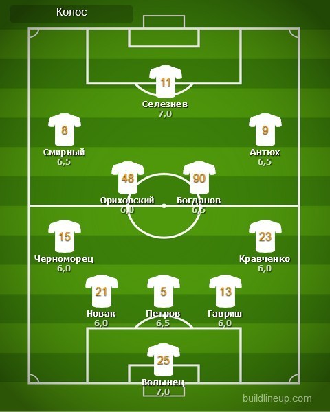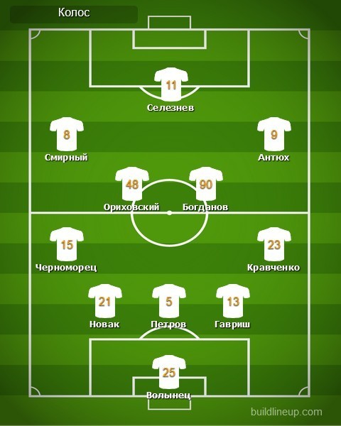 «Колос»: Евгений Волынец, Никита Кравченко, Виталий Гавриш, Кирилл Петров, Евгений Новак, Aлександр Черноморец, Андрей Богданов (Вадим Милько, 89), Павел Ориховский, Евгений Смирный (Олег Ильин, 80), Денис Антюх (Евгений Морозко, 73), Евгений Селезнев (Владимир Лысенко, 73)