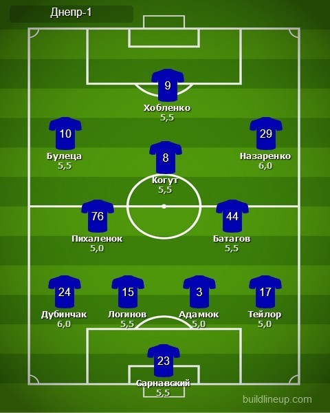 «Днепр-1»: Богдан Сарнавский, Владимир Адамюк, Лукас Тейлор, Сергей Логинов, Владислав Дубинчак, Арсений Батагов (Артем Довбик, 37), Aлександр Пихалёнок, Aлександр Назаренко (Андрей Цуриков, 70), Сергей Булеца (Франциско Ди Франко, 86), Игорь Когут (Дмитрий Коркишко, 86), Алексей Хобленко (Алексей Чичиков, 70)