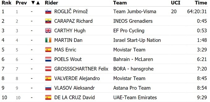 Словенец благодаря 6 секундам бонификации за второе место укрепил свое лидерство в общем зачете за два дня до финиша Вуэльты в Мадриде.