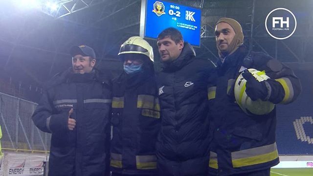 Форвард «Колоса» Евгений Селезнев сфотографировался с пожарными после игры на «Днепр-Арене».
