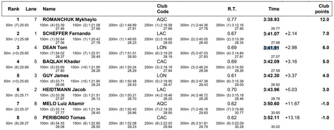 24-летний пловец финишировал первым на дистанции 400 м вольным стилем, установив новый рекорд Украины – 3:38.93.