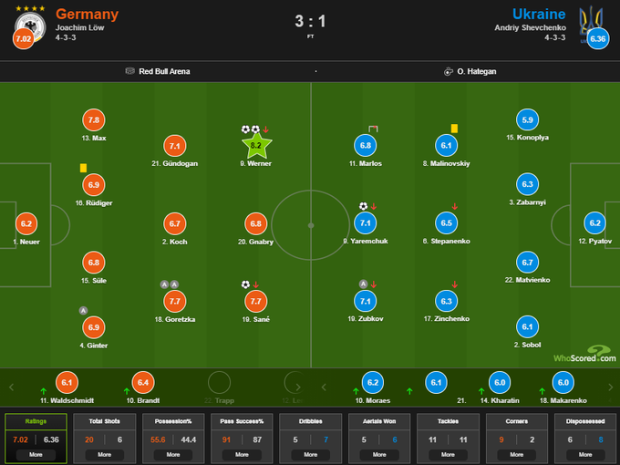 Оценки веб-портала WhoScored за матч 5-го тура Лиги наций Германия – Украина – 3:1.