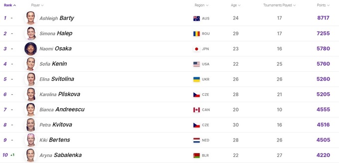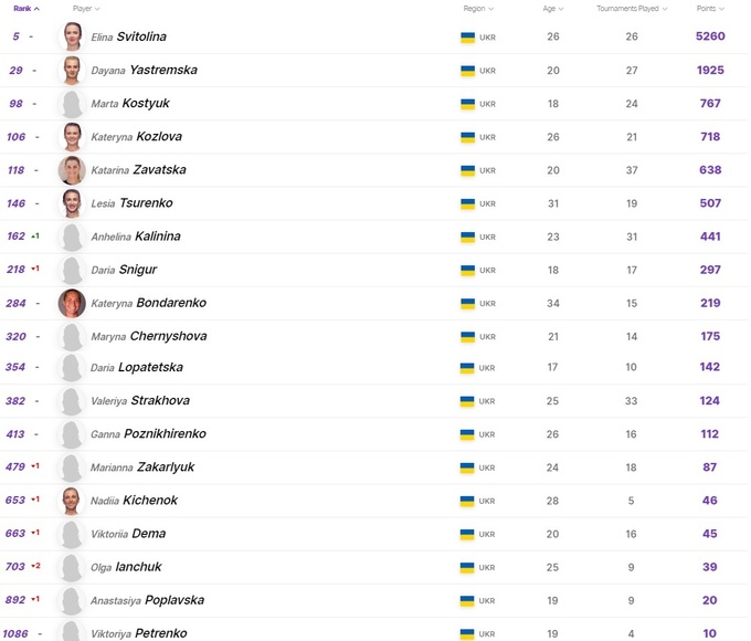 Что касается украинок, то Ангелина Калинина улучшила свое положение на одну позицию, Снигур, Закарлюк, Киченок, Дема, Янчук и Поплавская потеряли позиции.