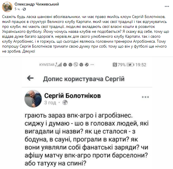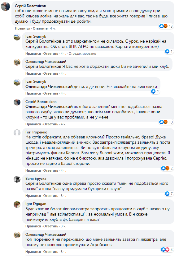 «Скажите, пожалуйста, уважаемые болельщики, имеет ли право какой-то клоун Сергей Болотников, который работает в структуре великого клуба «Карпаты», который имеет свои традиции, и так отзываться о клубах, которые имеют свои традиции, люди, которые вкладывают свои собственные средства в развитие украинского футбола. Ему почему-то название клубов не нравится? Я скажу от себя, потому что отдал очень много здоровья, нервов для своего любимого клуба «Карпаты», так и своего клуба «Агробизнеса», и я горжусь, что сегодня являюсь главным тренером «Агробизнеса». Поэтому попрошу Сергея Болотникова держать свое мнение при себе, потому что он в футболе еще ничего не сделал», – написал Чижевский.