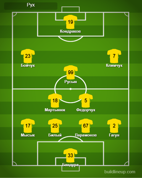 «Рух»: Бандура - Гагун, Билый, Парамонов, Мысык - Мартынюк, Федорчук, Русин, Климчук (Притула, 87), Бойчук - Кондраков (Кухаревич, 87).