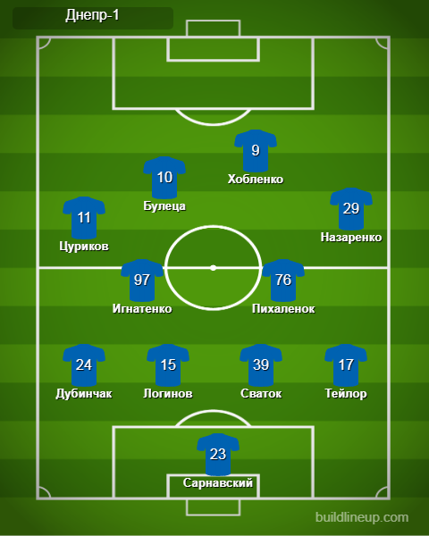 «Днепр-1»: Богдан Сарнавский, Тейлор (Алексей Чичиков, 70) , Александр Сваток, Сергей Логинов, Владислпав Дубинчак, Даниил Игнатенко, Александр Пихаленок, Андрей Цуриков, Александр Назаренко (Артем Довбик, 76), Сергей Булеца (Дмитрий Коркишко, 70), Алексей Хобленко