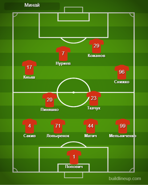 «Минай»: Андрей Попович (Антон Каниболоцкий, 57), Александр Снижко, Тарас Сакив, Василий Пиняшко, Максим Лопыренок, Даниил Кныш (Алексей Шпак, 72), Андрей Ткачук, Мислав Матич, Анатолий Нуриев, Денис Кожанов (Алексей Хахлев, 72), Кирилл Меличенко