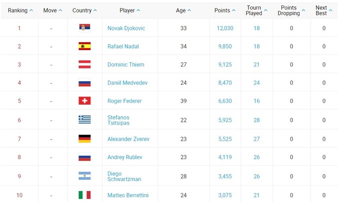 На прошлой неделе прошел мужской Итоговый турнир. Любопытно, что на распределение мест в первой десятке он не повлиял, но победитель Даниил Медведев существенно укрепил свою четвертую позицию. Теперь он имеет существенный отрыв от Роджера Федерера, замыкающего топ-5.