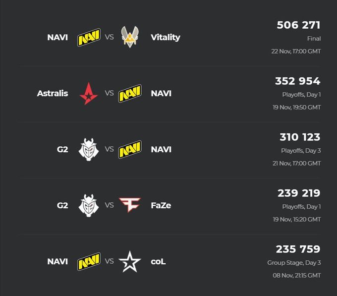 На втором месте по популярности находится противостояние в рамках плей-офф между NAVI и Astralis, а на третьем — встреча украинского клуба с G2 Esports. Оба матча в пике собрали более 300 тыс. зрителей.