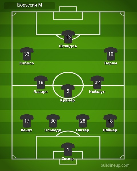 «Боруссия» М: Ян Соммер, Оскар Вендт, Нико Эльведи, Маттиас Гинтер, Штефан Ляйнер, Валентин Лазаро (Патрик Херман, 69), Флориан Нойхаус (Денис Закария, 69), Кристоф Крамер, Ларс Штиндль (Ласло Бенеш, 81), Маркус Тюрам (Ибраима Траоре, 84), Брил Эмболо (Алассан Плеа, 69)