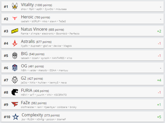 В топ-10 также произошло несколько изменений. G2 поднялись на четыре места и теперь расположились на 7-й позиции.
