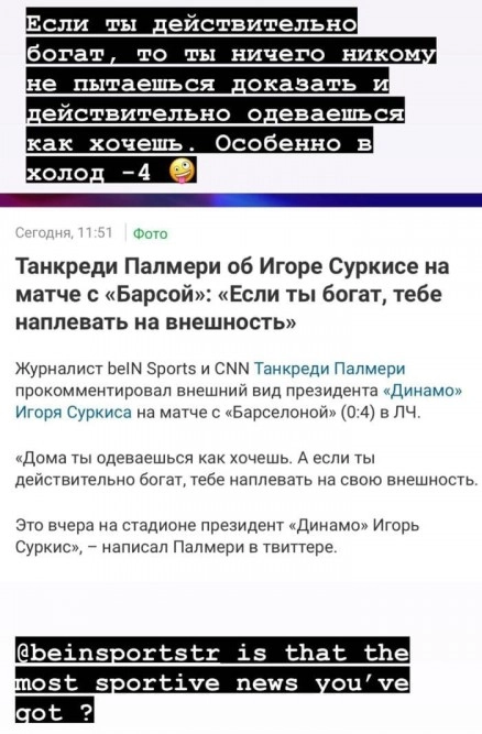 Ранее известный итальянец, работающий на beIN Sports и CNN, потроллил президента «Динамо» Игоря Суркиса за его внешний вид. Палмери выложил фото с матча киевлян в ЛЧ против «Барселоны» (0:4) и написал: