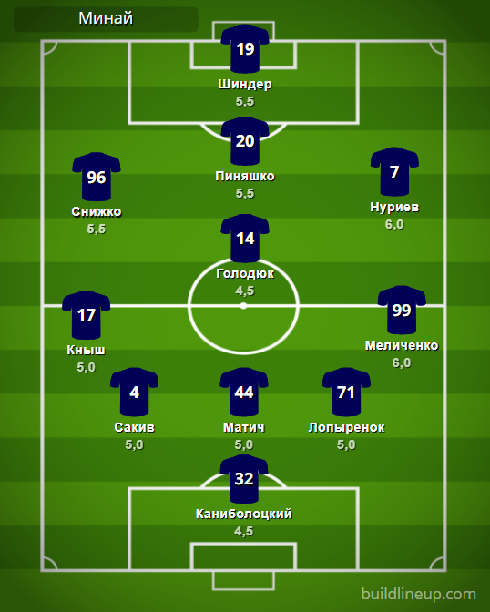 «Минай»: Каниболоцкий – Кныш (Шпак, 65), Сакив, Матич (Малепе, 65), Лопыренок (Маембе, 46), Меличенко – Снижко (Хахлев, 80), Голодюк (Ткачук, 46), Нуриев – Пиняшко – Шиндер.