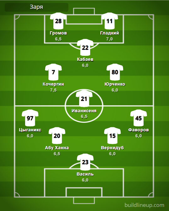«Заря»: Василь – Цыганикс, Абу Ханна, Вернидуб (Назарина, 65), Фаворов – Иванисеня – Кочергин (Гринь, 82), Юрченко – Кабаев (Чайковский, 82) – Громов (Перович, 74), Гладкий (Сайядманеш, 74).
