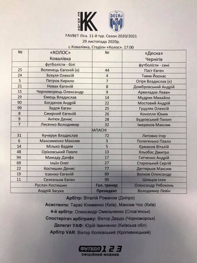 «Десна»: Евгений Паст, Йоонас Тамм, Владислав Огиря, Андрей Домбровский, Леван Арвеладзе (Сергей Старенький, 94), Михаил Мудрик (Илья Шевцов, 94), Андрей Мостовой, Алексей Гуцуляк (Максим Дегтярёв, 85), Ефим Конопля, Филипп Будковский, Максим Имереков