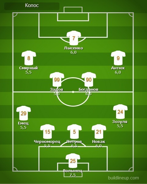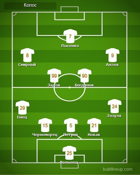 «Колос»: Евгений Волынец, Алексей Зозуля, Кирилл Петров, Евгений Новак, Aлександр Черноморец, Владислав Емец, Андрей Богданов, Евгений Задоя (Олег Ильин, 75), Евгений Смирный (Евгений Исаенко, 87), Денис Антюх (Павел Ориховский, 74), Владимир Лысенко (Евгений Селезнев, 53)