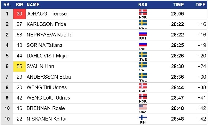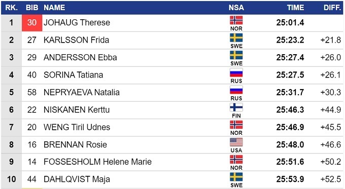 Действующий чемпион Кубка мира Тереза Йохауг выиграла разделку на 10 км классикой в рамках второго этапа мини-тура в финской Руке. Она опередила двух шведок – Фриду Карлссон и Эббу Андерссон.