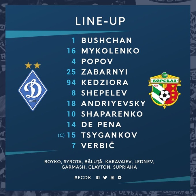 «Динамо»: Георгий Бущан, Виталий Миколенко, Илья Забарный, Денис Попов, Томаш Кендзёра, Aлександр Андриевский, Владимир Шепелев, Николай Шапаренко, Карлос Де Пена, Беньямин Вербич, Виктор Цыганков