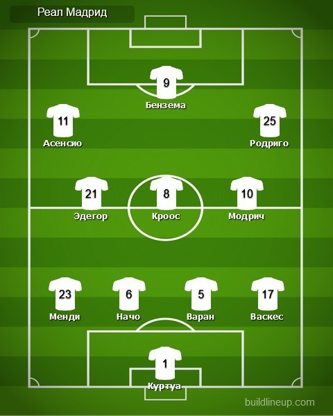 «Реал»: Тибо Куртуа, Рафаэль Варан, Начо, Ферлан Менди, Лукас Васкес, Тони Кроос, Лука Модрич, Мартин Эдегор (Иско, 77), Карим Бензема (Мариано Диас, 77), Марко Асенсио, Родриго (Винисиус Жуниор, 77)