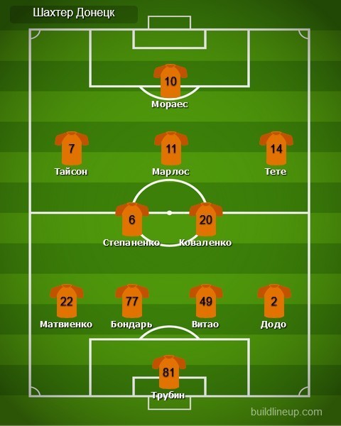 «Шахтер»: Анатолий Трубин, Николай Матвиенко, Валерий Бондарь, Витао, Додо, Тарас Степаненко, Виктор Коваленко (Алан Патрик, 85), Тайсон (Манор Соломон, 74), Ромеро Марлос (Майкон, 74), Тете, Жуниор Мораес (Дентиньо, 25; Фернандо, 85)