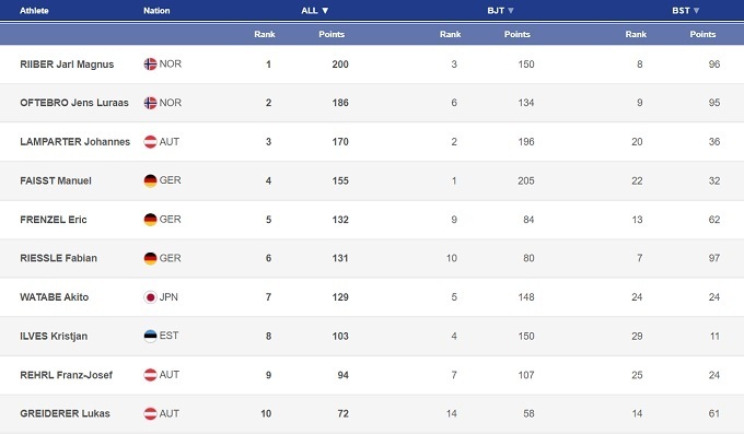 А вот главным открытием этапа в Руке можно назвать 19-летнего австрийского вундеркинда Йоханнеса Лампартера. В пятницу он выиграл прыжковую попытку и в итоге стал вторым – первый в карьере подиум на Кубке мира. После этого в субботу и воскресенье он стал четвертым и шестым, что дало ему третье место в общем зачете на данный момент. Такой прорыв Лампартера случился для Австрии очень вовремя: Франц-Йозеф Рерль остался на уровне прошлого сезона, а возвращение в Кубок мира Марио Зайдля после тяжелой травмы, как и прогнозировалось, оказалось непростым – для того, чтобы вернуть себе пиковую форму, ему понадобится время.