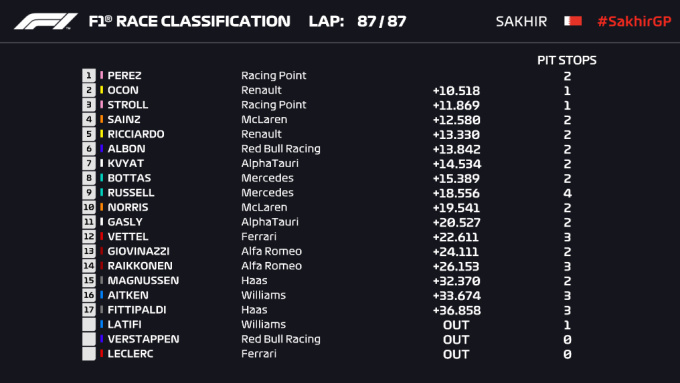 Проблемы Расселла открыли дорогу к победе Пересу. И Серхио впервые в карьере выиграл гонку Ф-1! Жаль, что пилот, скорее всего, останется без места в Ф-1 на новый сезон. Кроме того, на подиум поднялись Эстебан Окон и Лэнс Стролл. Вот так завершение этапа.