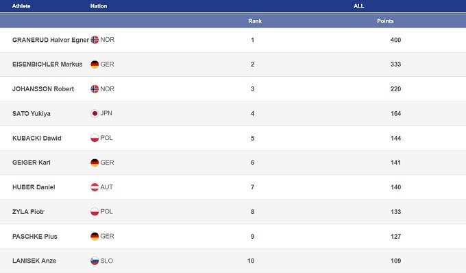 Ну и в итоге Айзенбихлер, который находится в блестящей форме, вместо заслуженного лидерства в общем зачете с преимуществом примерно в 100 очков покинул Нижний Тагил с отставанием в 66 баллов от Гранеруда. Конечно, учитывая блестящую форму Маркуса на старте сезона, можно сказать, что это лишь в плюс для интриги в общем зачете.