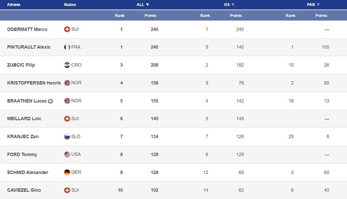 В то же время, фавориты в борьбе за Кубок мира, Алексис Пинтуро и Хенрик Кристофферсен, обменивались подарками. Кристофферсен дважды провалился (22-е и 12-е места), а Пинтуро дважды не сумел этим воспользоваться – два пятых места. В итоге Одерматт догнал в общем зачете Пинтуро – теперь они делят лидерство, имея по 240 очков в активе – и это при том, что Марко провел на один старт меньше. Перед стартом сезона швейцарца рассматривали как очень опасную темную лошадку в борьбе за общий зачет, однако с каждым стартом его фаворитизм становится все более явным.