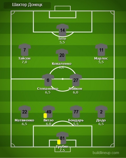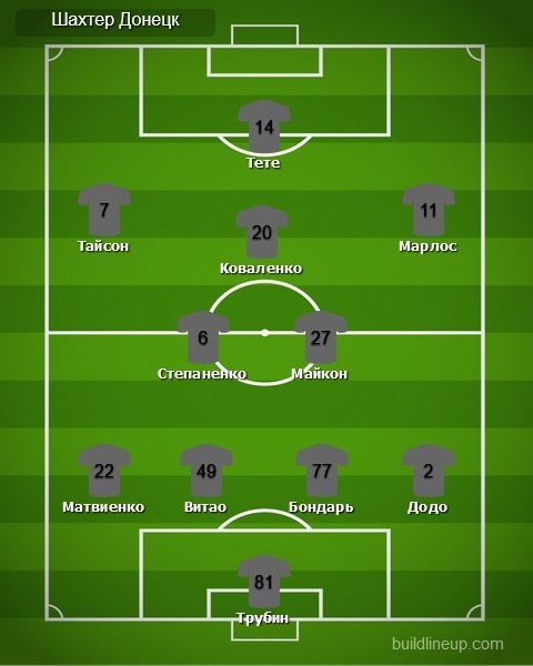 «Шахтер»: Анатолий Трубин, Николай Матвиенко, Валерий Бондарь, Витао (Давид Хочолава, 36), Додо, Майкон, Тарас Степаненко, Виктор Коваленко, Тайсон (Дентиньо, 86), Ромеро Марлос (Алан Патрик, 64), Тете (Манор Соломон, 65)