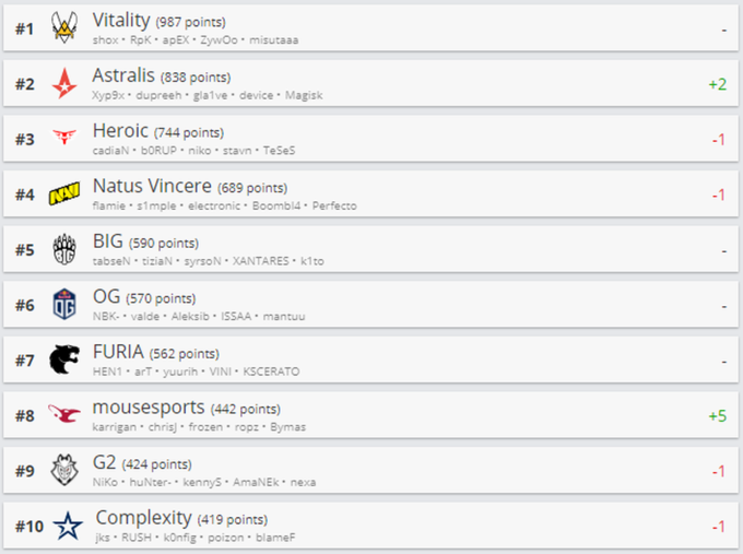 Natus Vincere покинули топ-3 и расположились на четвертом месте.