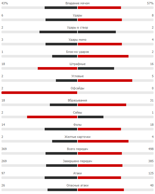 Подопечные Мирчи Луческу проиграли сопернику по владению мячом (43% против 57%). Команда из Венгрии также больше нанесла ударов по воротам (8 против 6), подала угловых (5 против 2) и сделала вбрасываний из аута (31 из 18). По ударам в створ равенство (2–2).